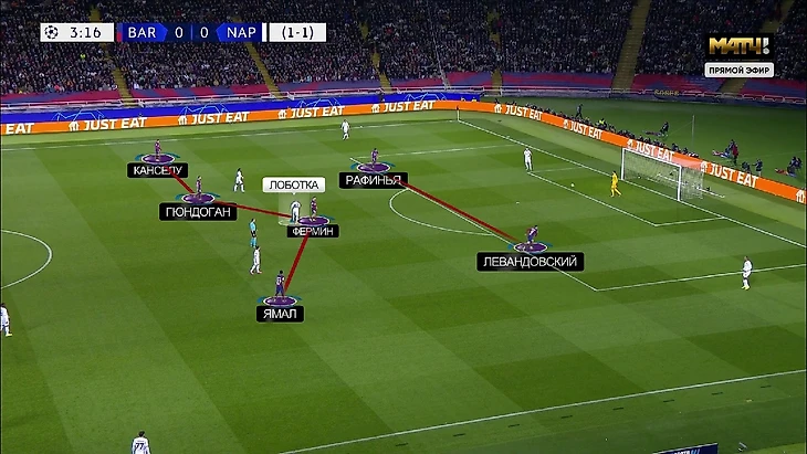 Хави преобразовал прессинг – теперь Рафинья поднимался на одну линию с Левандовским, Канселу и Ямал оставались на флангах, а Фермин действовал в роли десятки – по Лоботке: