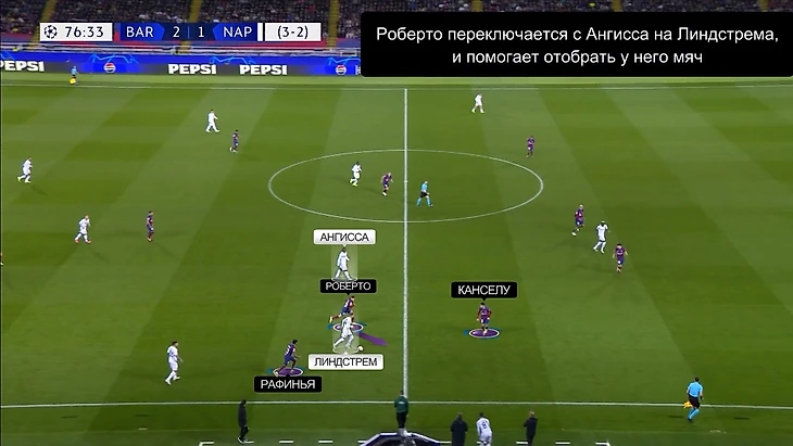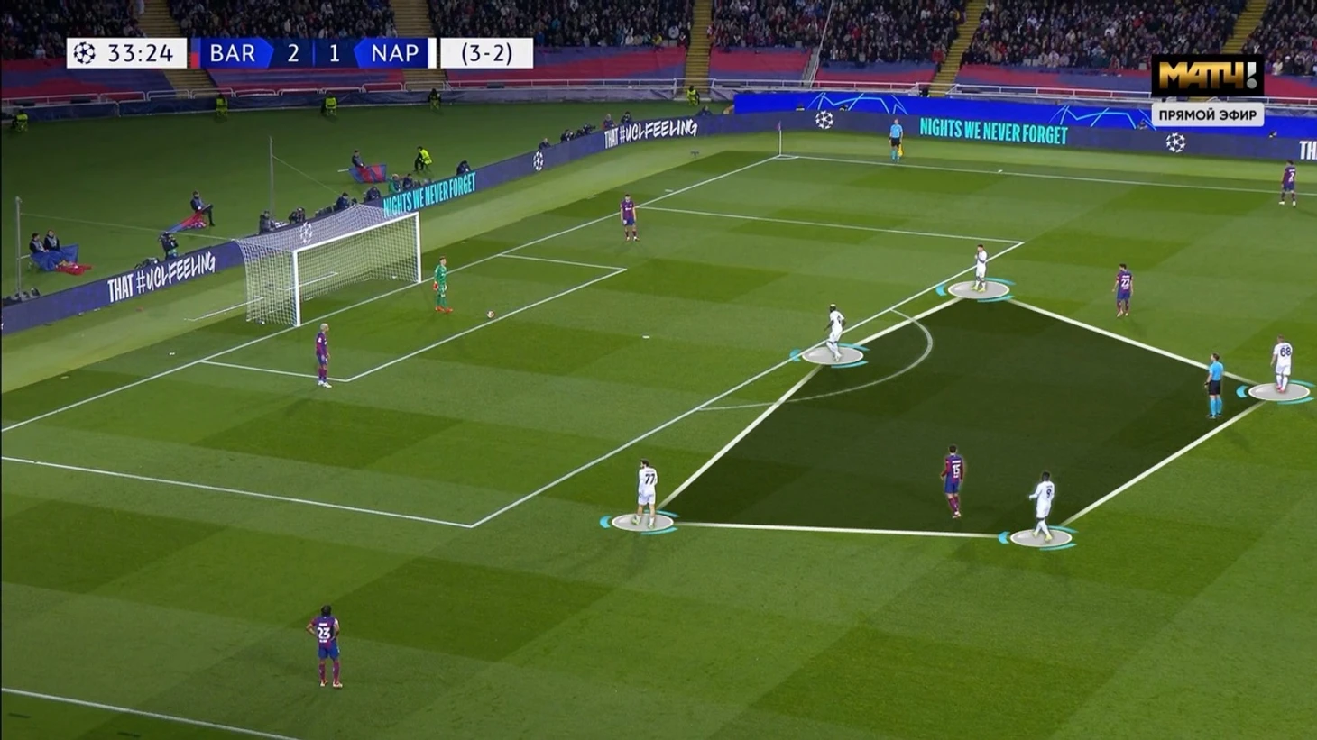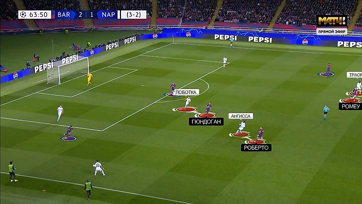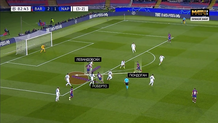 Работали по мячу, и включали интенсивность, когда он шёл на фланг – принцип такой же, как и у «Барселоны». У каталонцев перестал держаться мяч, и потери проходили примерно по одному и тому же шаблону: «Барсу» зажимают на фланге, игрок с мячом (чаще всего Кубарси) вынужден делать длинную передачу на Левандовского, Фермина или Гюндогана, на них выдвигаются защитники «Наполи», выигрывают борьбу и забирают владение: