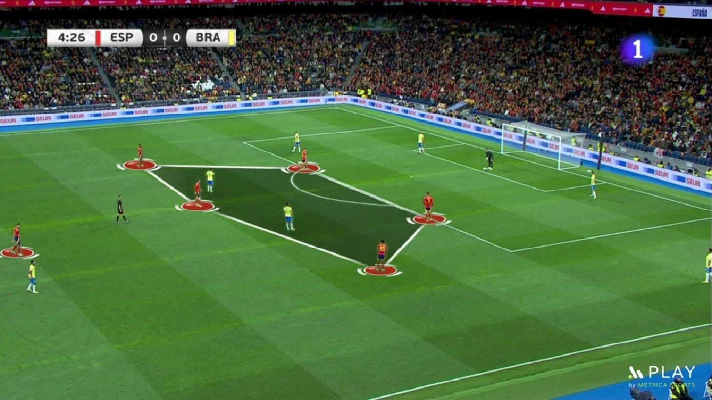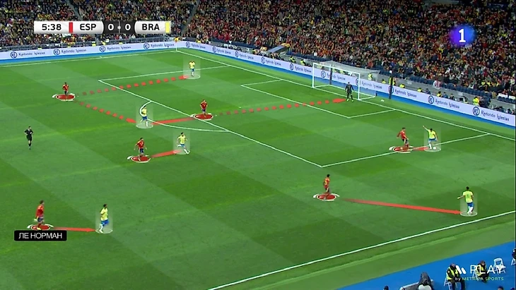 Блок из пяти человек организованно смещается по мячу, а опорник (Родри) читает игру и по необходимости присоединяется к давлению. Пас соперника на фланг – триггер для Испании, к давлению в этой зоне присоединяется крайний или центральный защитник, все короткие варианты перекрываются: