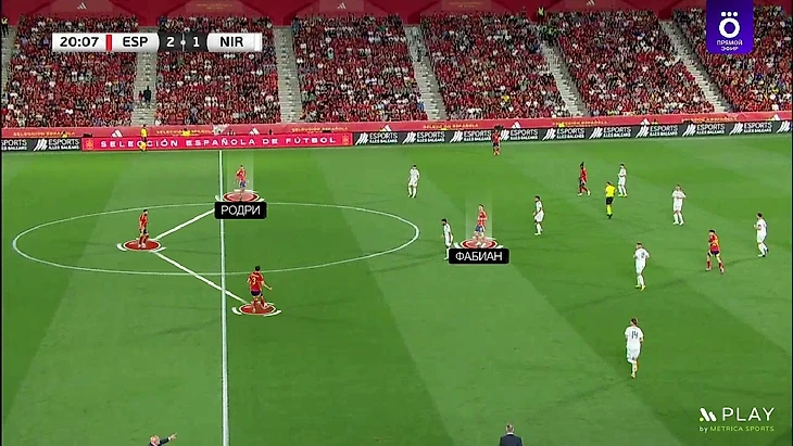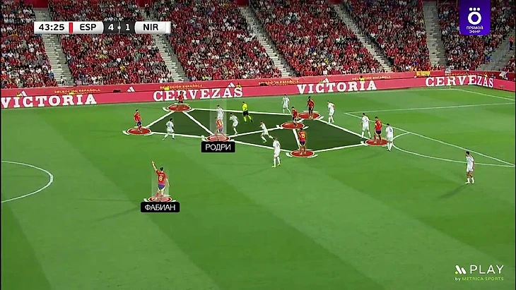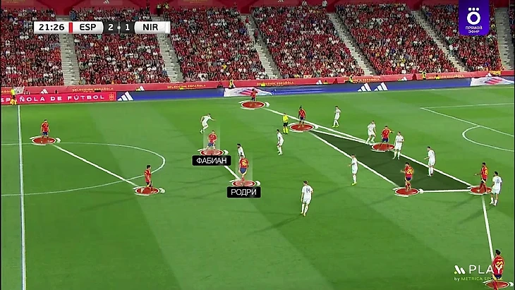 Часто Родри в первой стадии опускается в линию к защитникам – в таком случае Фабиан Руис заполняет позицию единственного опорника: