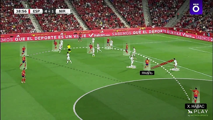 Структура владения испанцев в этом матче – радикально атакующие 2-2-6 или 3-1-6 (в зависимости от движения Родри и Фабиана). В конкретной игре ход сработал просто блестяще – Испания забила три гола из взаимодействий вингеров с крайними защитниками. Ламин Ямаль отлично себя проявил как полуфланговый созидатель – смотрите, какую голевую он вырезал именно из этой зоны: