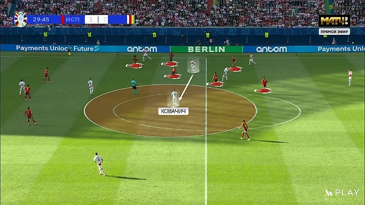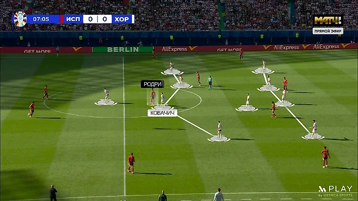 При игре без мяча Хорватия уделила максимальное внимание Родри. Понятно почему: он ключевой элемент в полузащите Испании, контролирующий опорник, который при этом может и напрямую обострять. Специальное задание получил Матео Ковачич – он персонально играл по Родри: