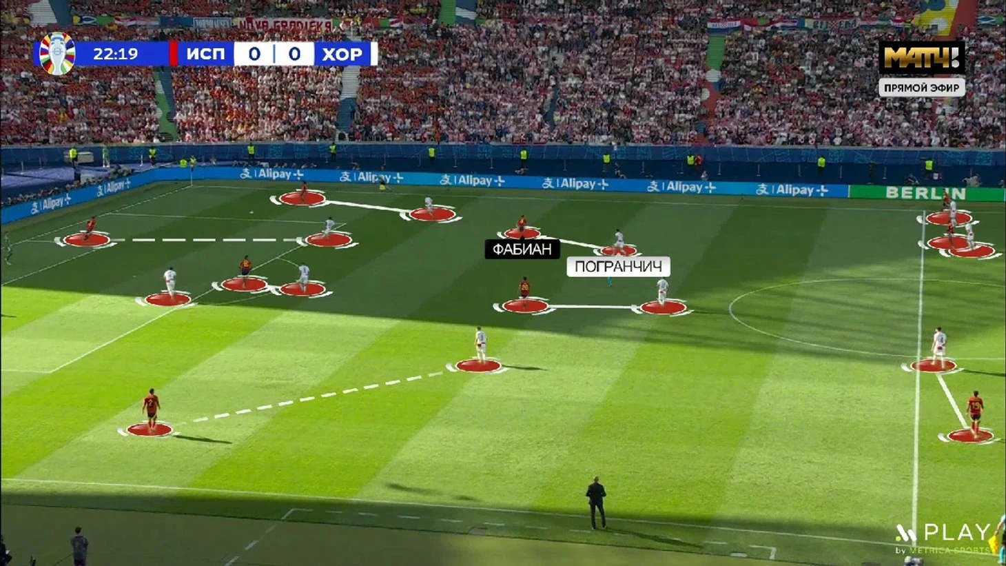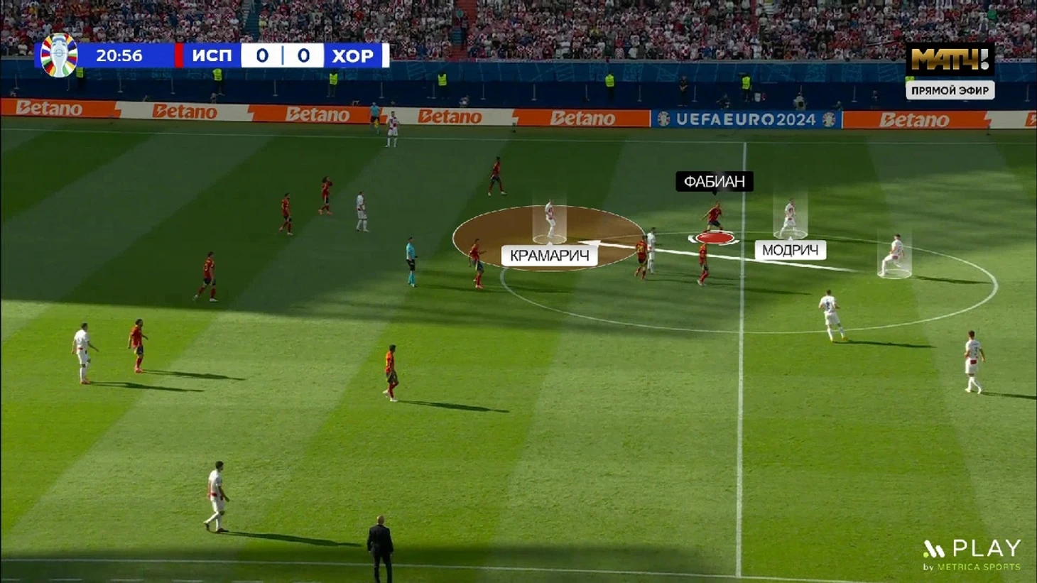Ковачич дисциплинированно работал по Родри и его действительно удалось сильно ограничить, что уже неплохо. Но свободу регулярно стал получать Фабиан Руис – его нейтрализации хорваты не уделили должного внимания. На первых минутах Испания выходила в атаку буквально по одному шаблону: Модрич застревает впереди (давит на ЦЗ Испании – Начо), Майер давит на Кукурелью, а Фабиан совершенно без опеки спокойно получает мяч: