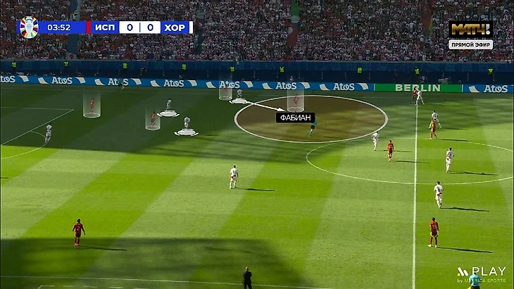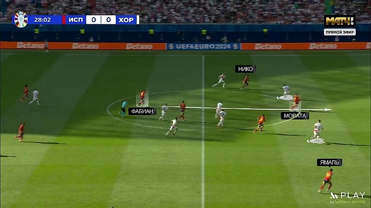 Испанцы выигрывают подбор, мяч получает Родри, затем передает его Фабиану, а у хорватов сзади два центральных защитника остаются против Уильямса, Мораты и Ямаля – Фабиан вырезает шикарный пас на Альваро: