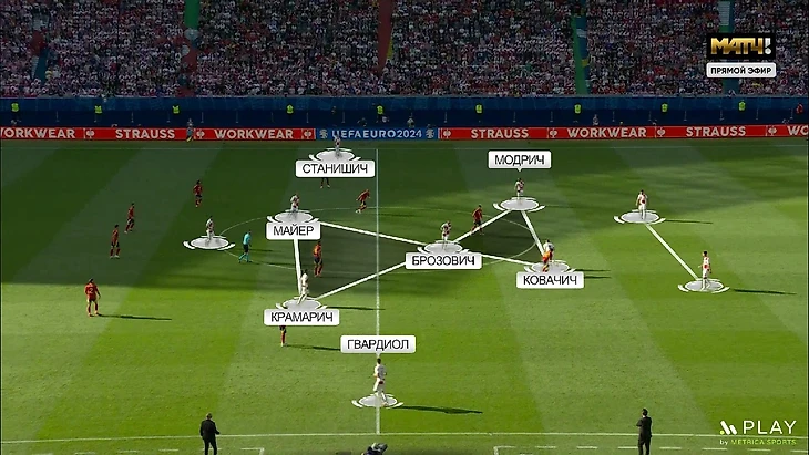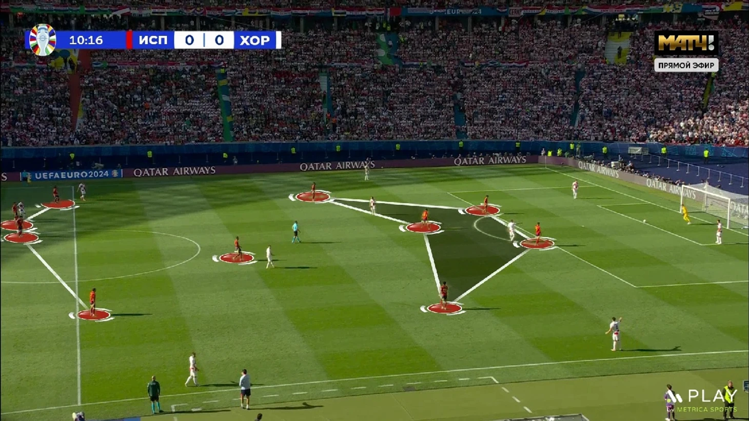 В центре поля у Хорватии становилось 5 человек, что позволяло иметь численный перевес, при этом угроза с флангов никуда не исчезала, так как эти зоны все равно заполнялись. К тому же, эта пятерка в полузащите хорватов очень разнообразно двигалась – это путало прессинг испанцев и Хорватия легко разбивала это давление.