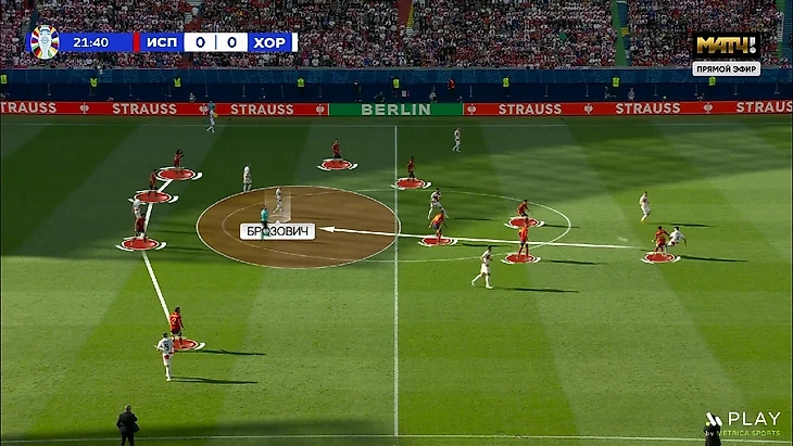Вот тут снова хорваты выманивают Испанию в прессинг – теперь Брозович свободным получает мяч между линий: