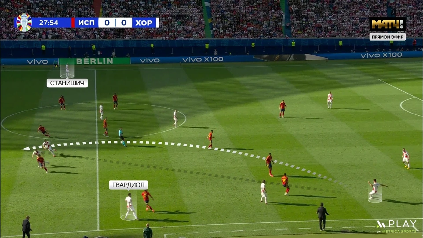 Высокие позиции Станишича и Гвардиола несли в себе определенный риск. В такой конфигурации у Хорватии сзади оставались лишь два защитника, а фланги были оголены. Вдвойне рискованно эта задумка выглядит из-за качеств Нико Уильямса и Ламина Ямаля – быстрых и техничных вингеров, превосходно чувствующих себя на пространстве. При таких вводных данных угроза в переходных эпизодах очевидна.