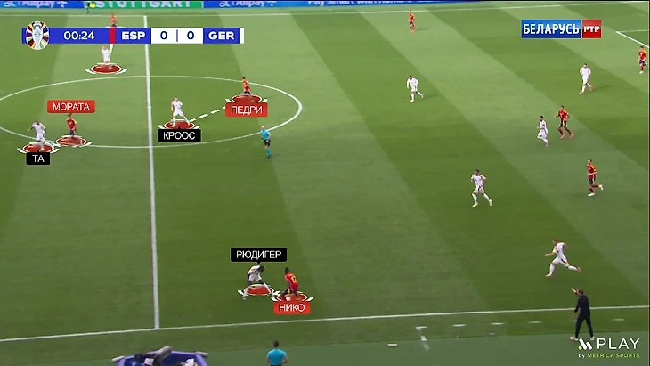Сзади оставались соотношения 1-в-1 – Рюдигер играл с Нико Уильямсом, Та с Моратой, Раум с Ямалем и Кроос с Педри: