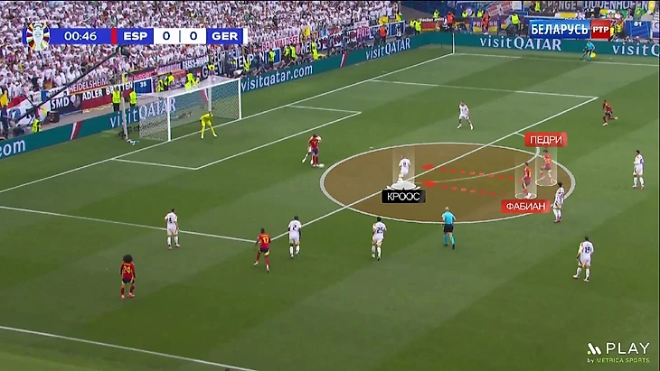 Главная причина: другие установки команде при игре без мяча. Частично мы уже этого касались – в прессинге немцы встречали 1-в-1. Партнер Крооса по опорной зоне (сначала Джан, а потом Андрих) играл по Фабиану, который часто опускается к Родри для помощи в продвижении. Во-первых, Кроос в таком случае остается с Педри (в дальнейшем с Ольмо), что уже выглядит странно, учитывая не самый подходящий для нейтрализации соперников набор скиллов у Тони. Во-вторых, Кроос в принципе при таких установках должен оборонять довольно большую зону в одиночку – это может быть под силу для Канте или пикового Каземиро, но точно не для Тони Крооса.
