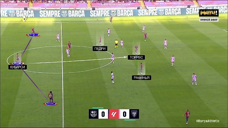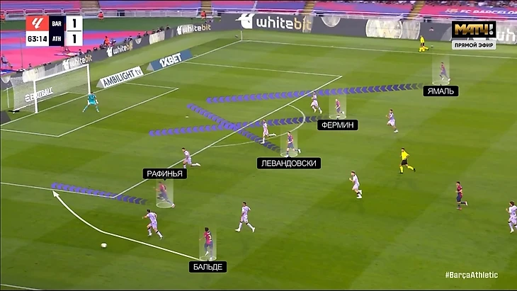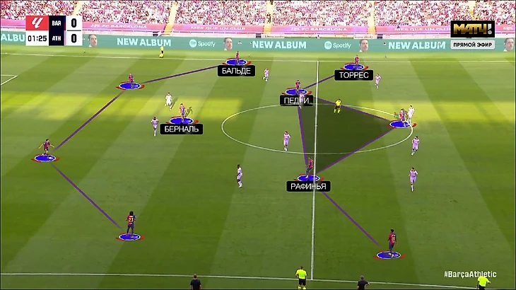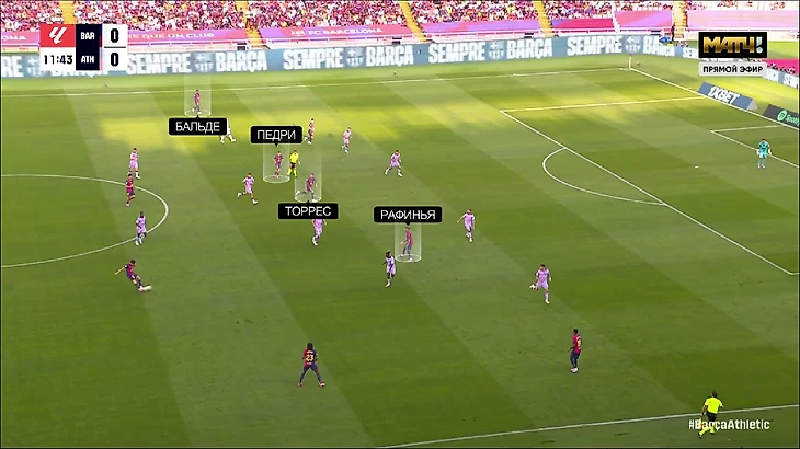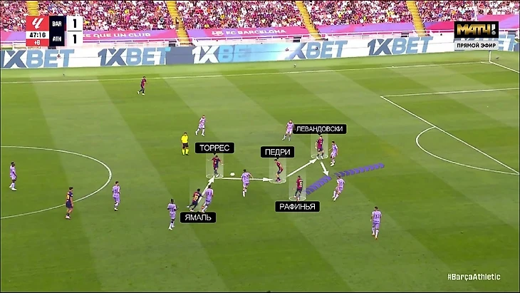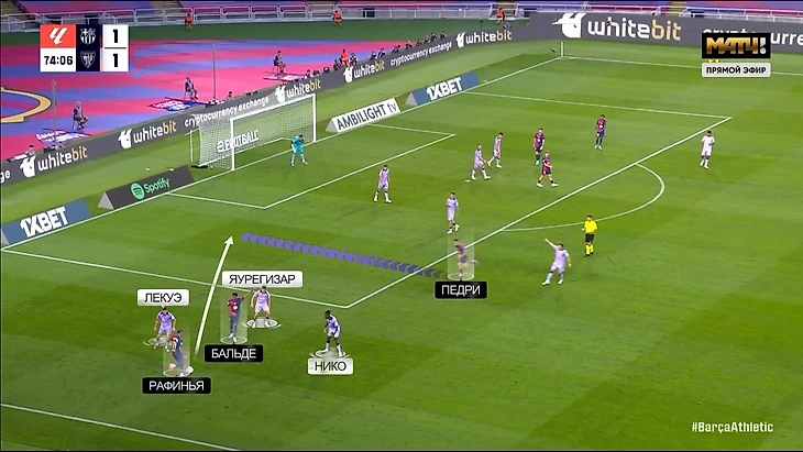Почти вся угроза во втором тайме пришла именно с левого фланга. И гол тоже. Рафинья и Бальде стянули на фланг Лекуэ, Яурегизара и Нико Уильямса, а Педри ворвался в штрафную через полуфланг – Рафинья его подключил, а потом Левандовски замыкал в пустые: