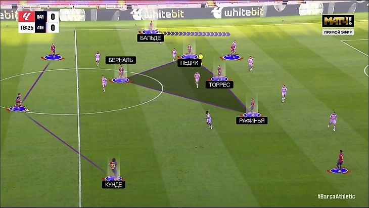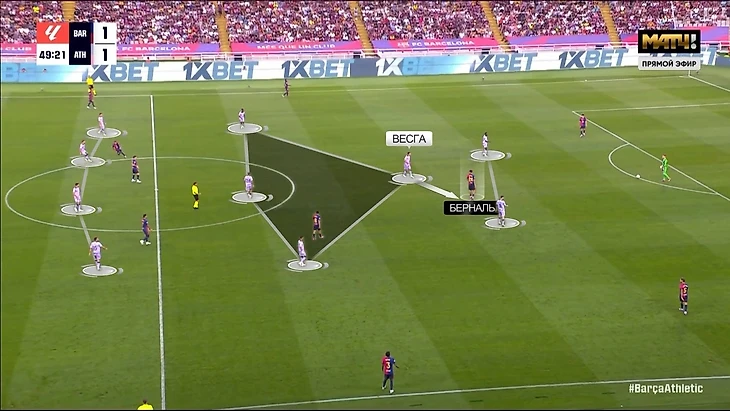 Отличие от прошлого матча – Берналь почти не опускался к защитникам, образовывая тройку в первой стадии. Вместо этого тройка в начале получалась более привычной для «Барселоны» способом – Жюль Кунде оставался в линии с ЦЗ. Эпизодическая структура – 3-1-5-1: