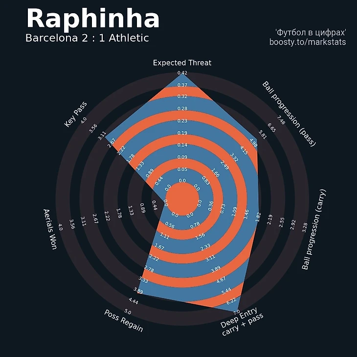 Рафинья – лучший игрок матча. Бразилец и при Хави эволюционировал, превращаясь в универсала, но Флик и вовсе из него делает чуть ли ни тотального футболиста. Куда ни глянь, везде Рафинья в числе лучших: по передачам под удар (3), по ожидаемой угрозе (0,42), по продвигающим передачам (8) и даже по возвратам мяча (5). Был эффективен и как десятка, и как левый вингер. Ну просто монстр!