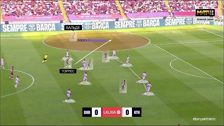 Происходило это следующим образом: Ферран Торрес смещается в центр и играет в чужой опорной, в Алекс Бальде располагается высоко и широко – структура с тремя десятками, как это было и в матче с «Валенсией»: