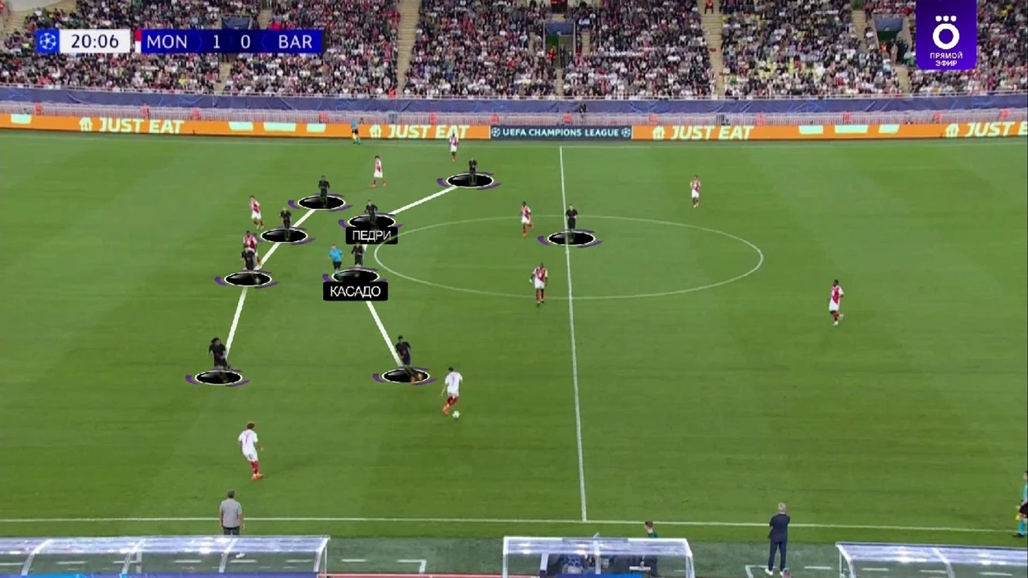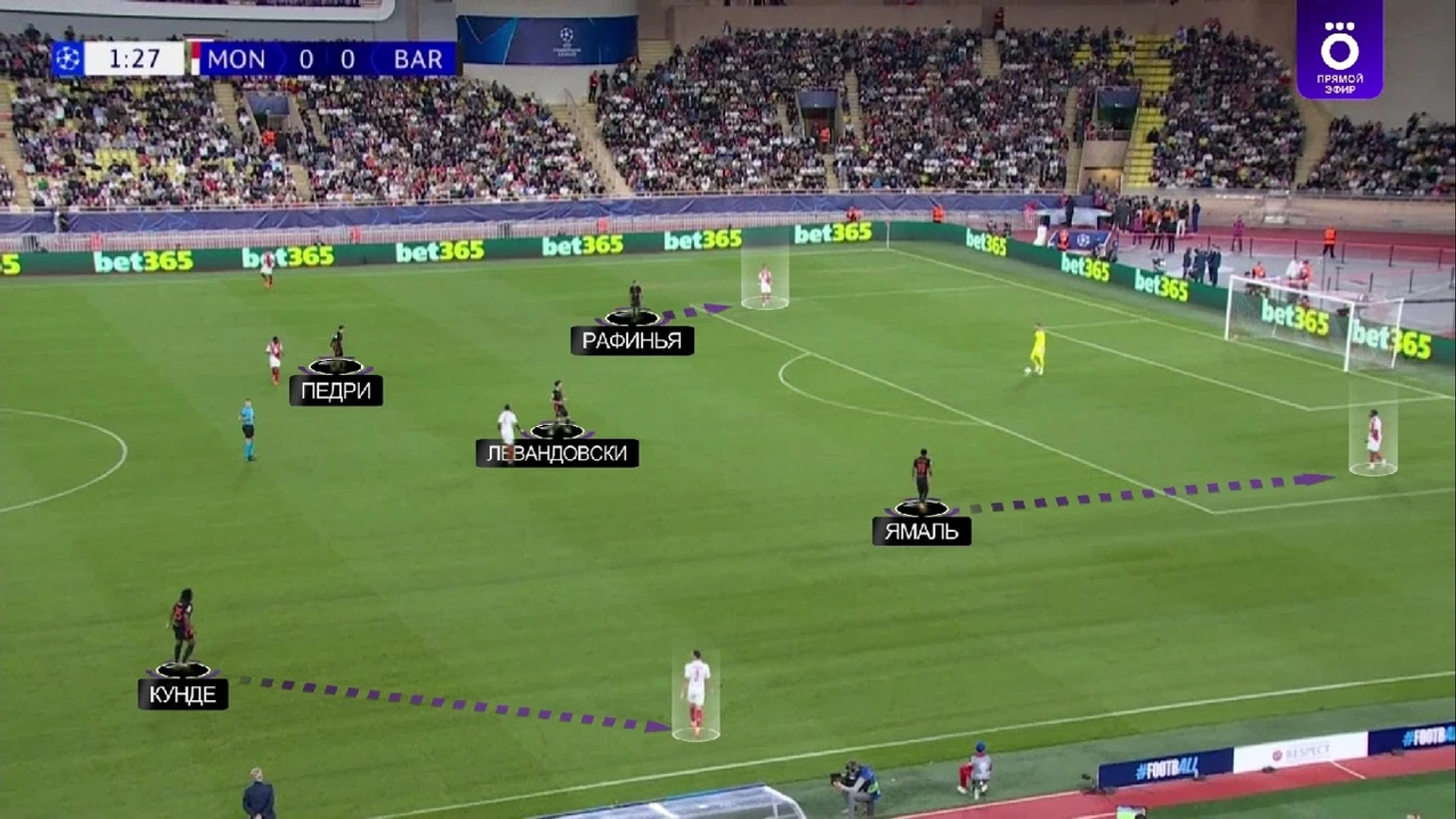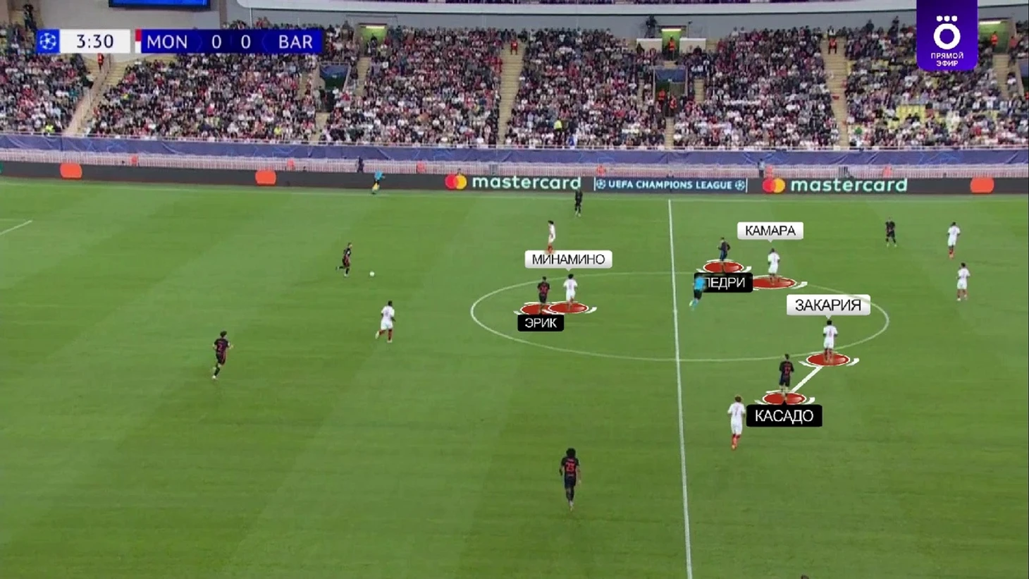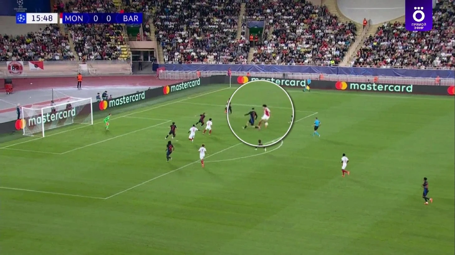 Монегаски в этот отрезок почти не разыгрывали коротко и просто выбивали мяч вперед, поэтому «Барса» легко захватила контроль – 69% владения до удаления. При этом без опасных моментов в принципе – только 1 удар на обе команды за 11 сыгранных минут.
