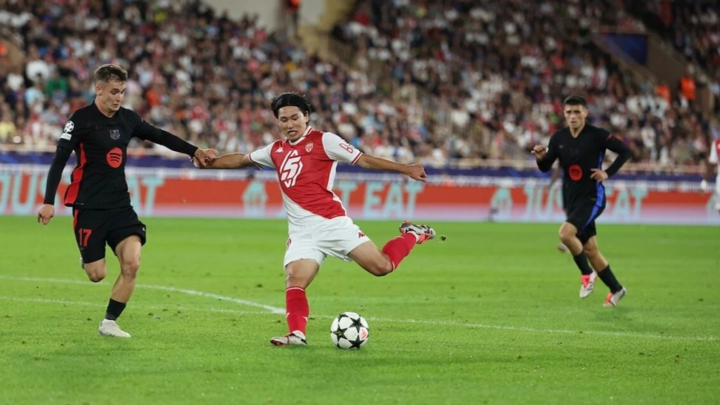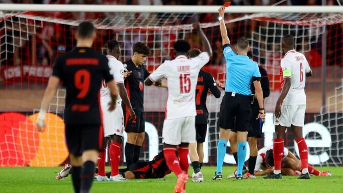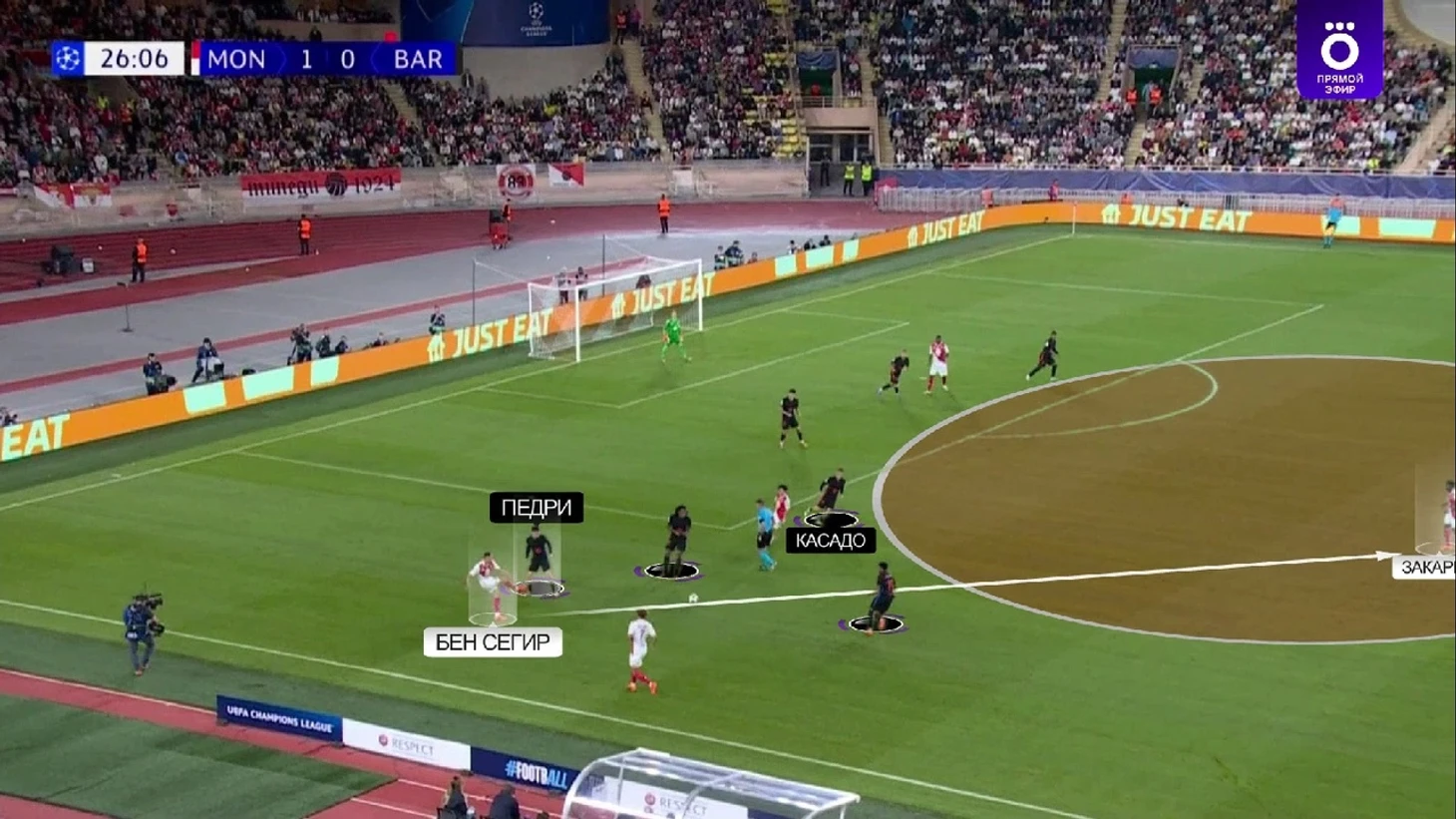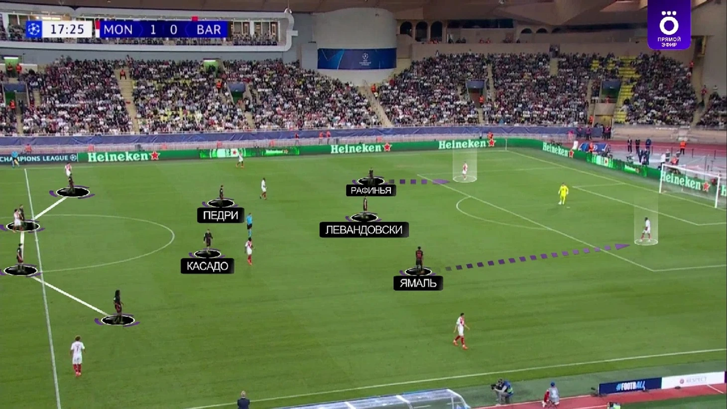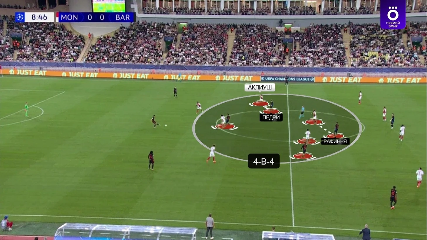 Монегаски в этот отрезок почти не разыгрывали коротко и просто выбивали мяч вперед, поэтому «Барса» легко захватила контроль – 69% владения до удаления. При этом без опасных моментов в принципе – только 1 удар на обе команды за 11 сыгранных минут.