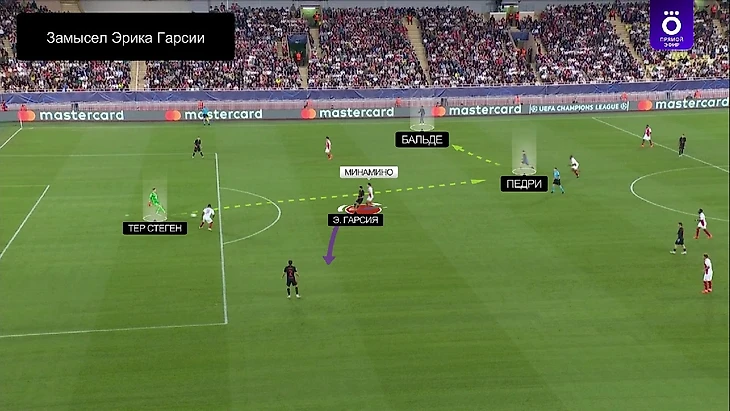 Видя, что Минамино плотно опекает, Эрик хотел увести японца в сторону, чтобы освободить для тер Стегена линию передачи на Педри. Там вырисовывался неплохой вариант, ведь Бальде оставался совершенно без опеки слева, и мяч до него через Педри мог дойти:
