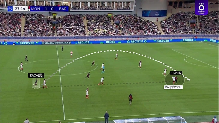 У «Монако» было больше ходов. Во-первых, команда вышла играть в 4-2-3-1 – это не сюрприз, но Ади Хюттер варьирует схемы «монегасков». Самый яркий ход – переместить Вандерсона – правого защитника – на левый фланг обороны. Это адаптация под Ламина Ямаля – когда-то Жозе Моуринью, еще будучи тренером мадридского «Реала», так использовал Альваро Арбелоа в попытках остановить Лионеля Месси. Нестандартный и довольно элегантный ход Ади Хюттера, пропитанный особым уважением к каталонскому вундеркинду.