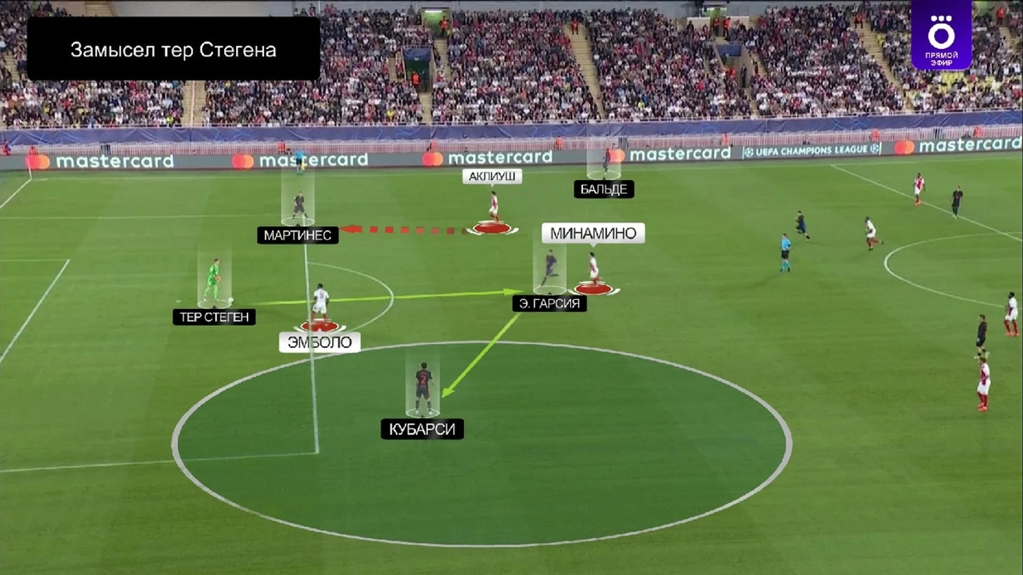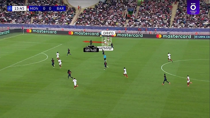 Ситуация: тер Стеген с мячом, «Монако» оказывает давление. Эмболо закрывает линию передачи на Кубарси, Аклиуш готов давить на Мартинеса, в случае паса на него, а Минамино плотно играет с Эриком Гарсией. Без давления в билд-апе два футболиста «Барсы» – Кубарси и Бальде. Замысел тер Стегена заключался в том, чтобы сделать пас на Эрика Гарсию, а тот в касание отправил бы мяч на свободного Кубарси – прессинг «Монако» в таком случае был бы разбит: