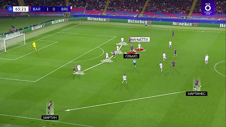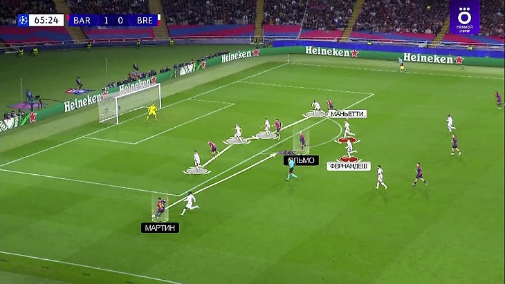 В своей любимой зоне Дани был гораздо эффективнее, чем в предыдущем матче. «Брест» постоянно терял кого-то из полузащитников «блауграны» – чаще всего это были Фермин и как раз Ольмо. Дани разогнал просто кучу атак и даже забил гол. Там, кстати, его тоже потеряли, но не сразу. С самого начала эпизода с ним действовал Маньетти, но затем проспал рывок Ольмо: