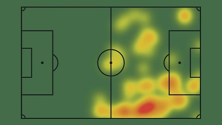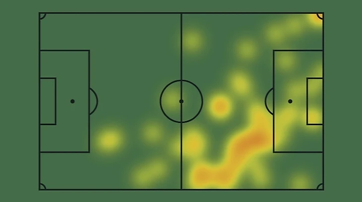 Первый шаг: теперь Рафинья был больше прикован к флангу. Он не лишился свободы перемещения и открываний, как он любит, но проводил на бровке гораздо больше времени, чем в предыдущем матче. Если сравнить тепловые карты Рафиньи в формате «было/стало» против «Сельты» и против «Бреста», разница станет очевидной: