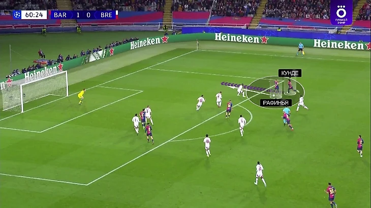 Это не значит, что бразилец вообще не смещался в центр – смещался. И Кунде тоже подключался к атакам широко по бровке. Изменились пропорции – Рафинья чаще всего был адресатом для передач именно широко справа. Кунде же своевременно поддерживал его рывками – в таком режиме бразилец и француз часто взаимодействовали в прошлом сезоне, и делали это весьма успешно.