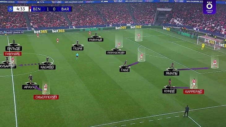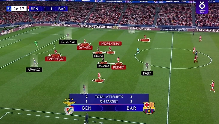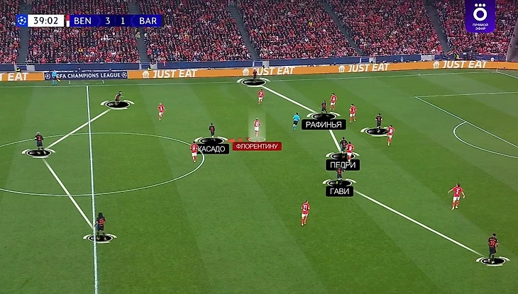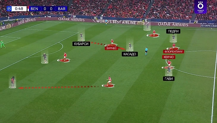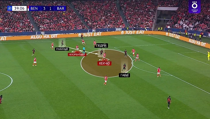Начали матч «орлы» с очень агрессивного давления. Касадо, Педри и Гави в центре поля игроки «Бенфики» передавали друг другу. Изначально Эурнес перекрывал Касадо, Флорентину играл по Педри, а Кекчю по Гави: