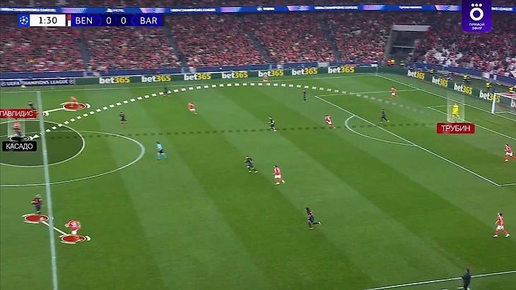 Именно так началась атака на первый гол «Бенфики»: Трубин выносит на Павлидиса, который оказался против Касадо. Хозяева легко цепляются за мяч и закрепляются на чужой половине поля: