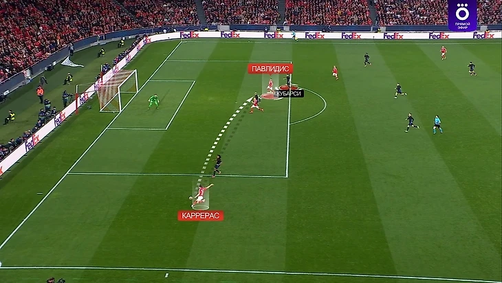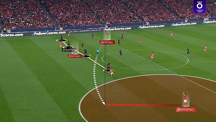 Третий гол «Бенфики» начался с аута. Каррерас вбросил на Павлидиса, и Араухо выдвинулся за греком из линии: