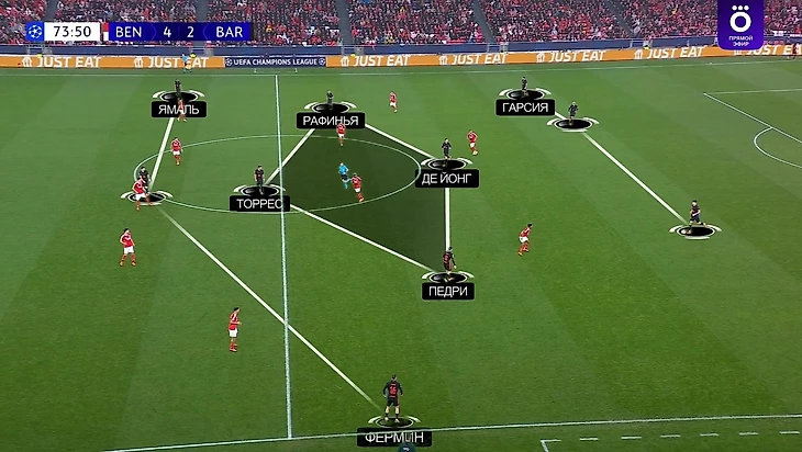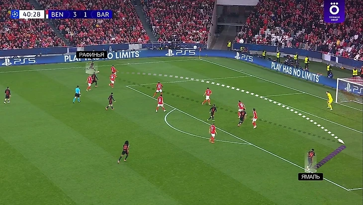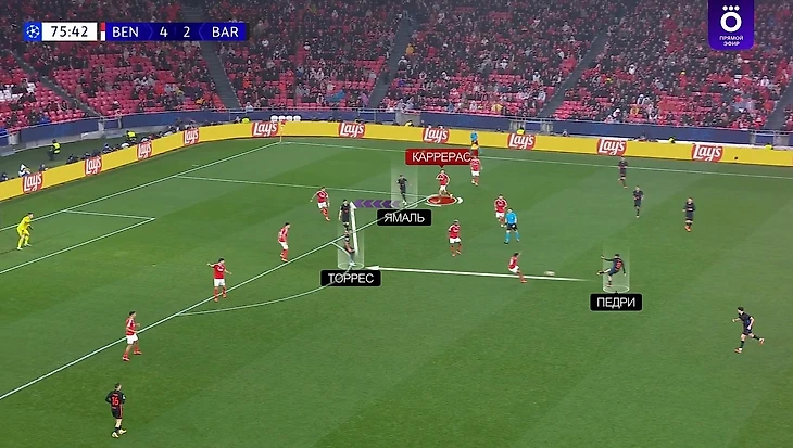 «Барса», ожидаемо, взвинтила темп, а «Бенфика» даже после оборонительных замен перестала успевать. Именно это произошло в моменте с пенальти на Ямале: Педри делает рискованный пас на Торреса в чужую опорную, Ферран сразу же в касание отправляет мяч в штрафную и там Каррерас не успел за Ямалем и прихватил того за футболку:
