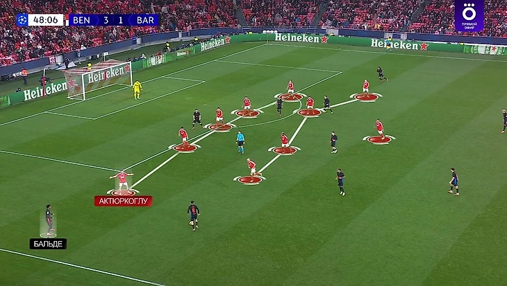 А вот на другом фланге Актюркоглу действовал в более высокой позиции – для создания большей контратакующей угрозы. Это и стало уязвимостью обороны «Бенфики» в первом тайме – «Барса» акцентированно била в эту зону. Вот пример ситуации, где каталонцы получают преимущество 5-в-4 в последней линии, а Бальде принимает мяч за спиной Актюркоглу. Момент закончится голевым шансом Ламина Ямаля: