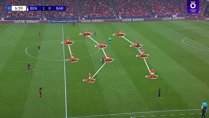 «Бенфика» таким образом действовала только на стартовом отрезке, и в самом начале действительно заставила «Барселону» даже паниковать. Однако каталонцы быстро вошли в привычный ритм – полностью забрали владение и территорию, а «Бенфика» стала встречать в среднем и низком блоке.