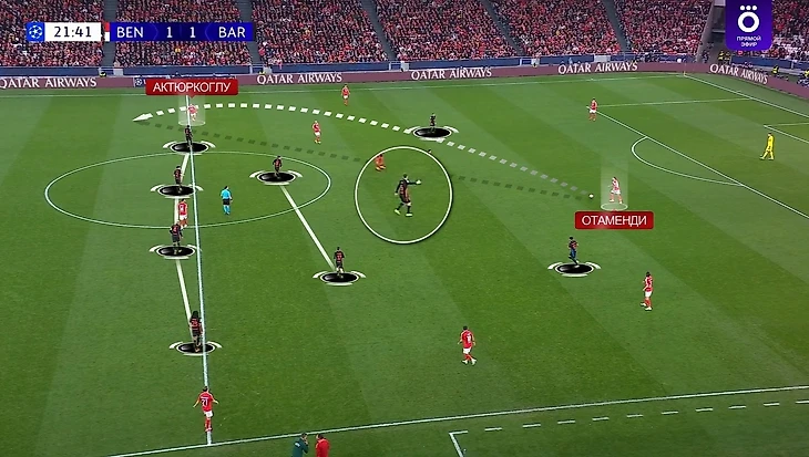 Также «Барселона» в привычных по этому сезону объемах насыщала чужую опорную – игроков «Бенфики» часто просто не хватало, чтобы накрыть. Вот один из примеров: «Барса» выстраивается в уже привычную структуру с тремя десятками – Флорентину ориентирован на Касадо: