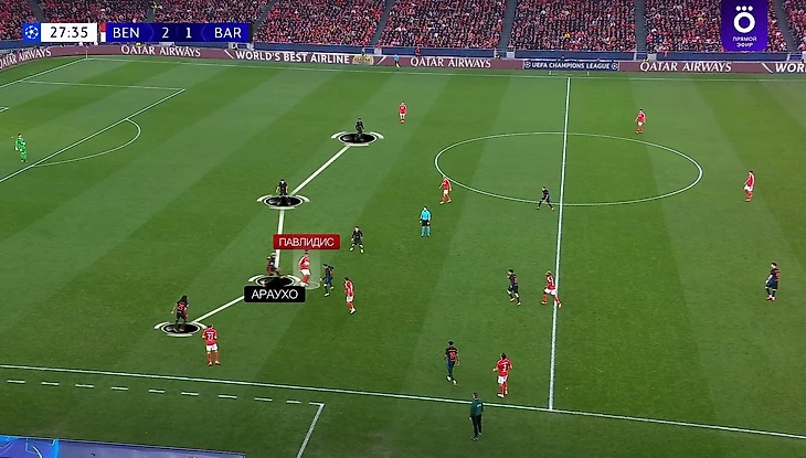 Однако, как мы уже ранее говорили, это работало в обе стороны. Далеко не всегда «Бенфика» просто выносила на Павлидиса – иногда он оказывался против Кубарси, и победа в верховом единоборстве уже не была столь очевидной. Чаще всего в первом тайме «Бенфика» разыгрывала коротко, подставляясь под прессинг «Барселоны». После высоких отборов каталонцы создали два явных шанса в первом тайме.