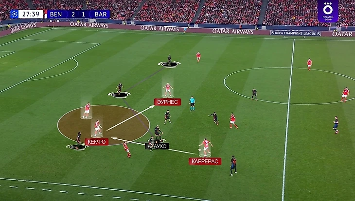 А дальше «Бенфика» использовала конспекты «Баварии», «Дортмунда» и «Лас-Пальмаса»: заставила «Барселону» стянуться на одну половину поля, а затем резко перевела на другую, свободную половину на Альваро Каррераса: