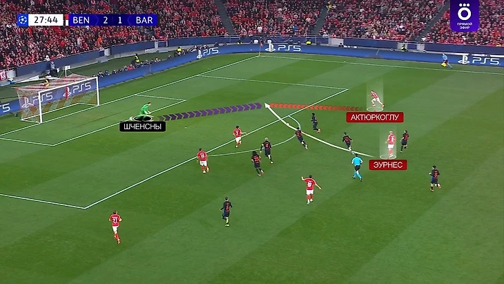 «Бенфика» к тому моменту уже окончательно перешла в режим удержания счета. Один из ходов Лаже – снять с игры Актюркоглу, выпустить Александера Ба (профильного правого защитника) и уже окончательно перейти на пятерку защитников: