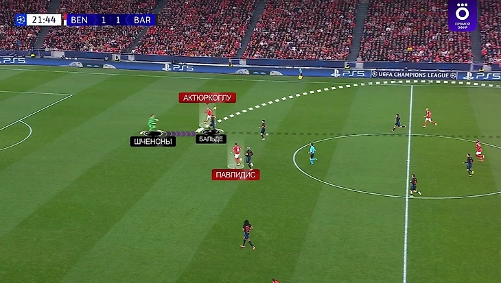 Но такие ситуации регулярно возникают в каждом матче «Барсы» – обычно именно в такие моменты каталонцы ловят своих соперников в офсайд. Но если не удается, то пытаются тушить пожар скоростью защитников, и уже самый последний рубеж – выходы голкипера. В данном случае заброс следовал на Актюркоглу, но более скоростной Бальде был первым на мяче. Шченсны плохо прочитал ситуацию, зачем-то выбежал, сбил Бальде и по сути просто подарил гол «Бенфике»: