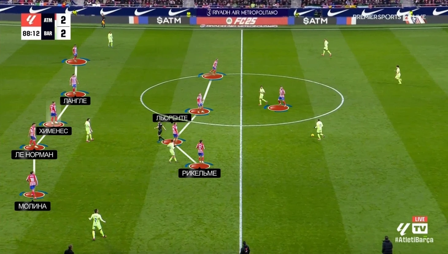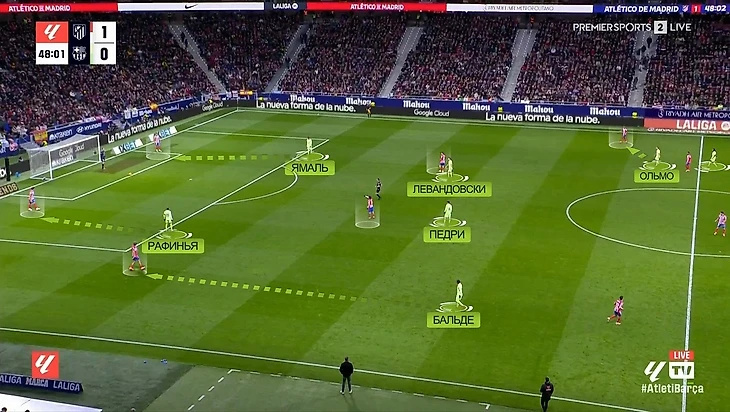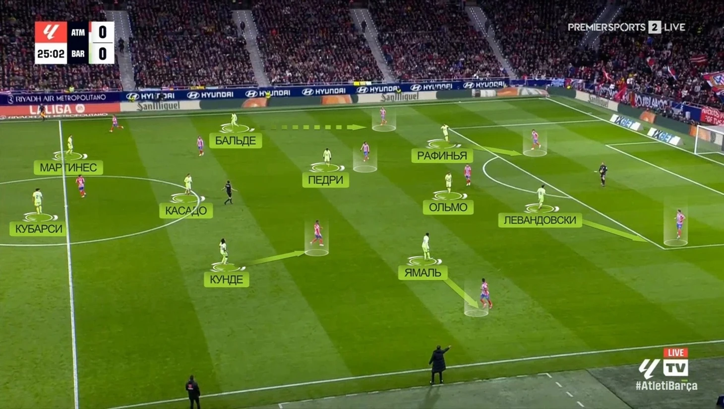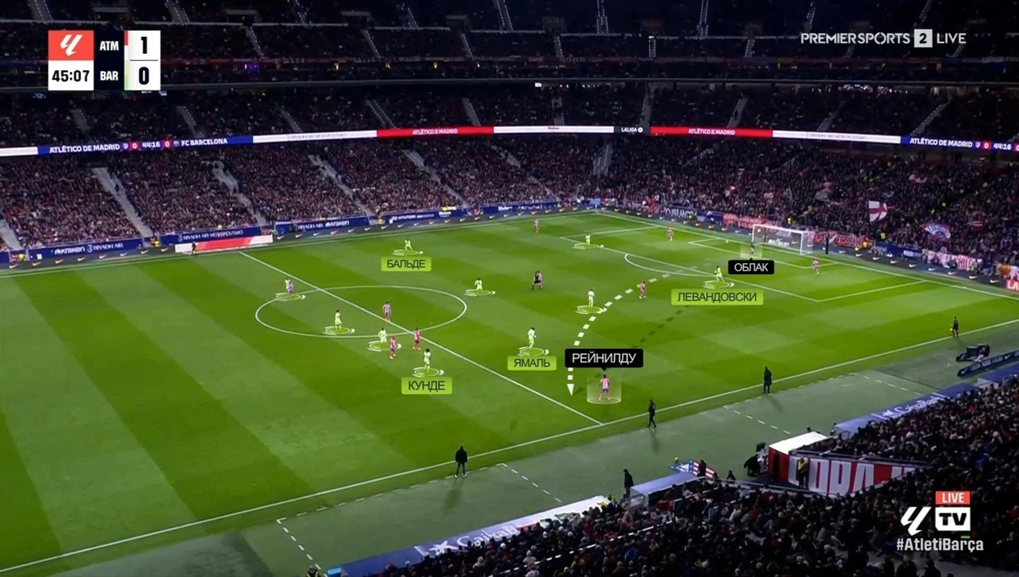 Косвенным признанием ошибки со стороны Флика стал откат к стандартному варианту со второго тайма – теперь по ЦЗ «Атлетико», по классике, действовали Рафинья и Ямаль, а Левандовски был во второй волне давления, и, самое главное, у Рейнилду был прямой опекун (Ольмо), из-за чего Кунде не должен был разрываться между двумя игроками: