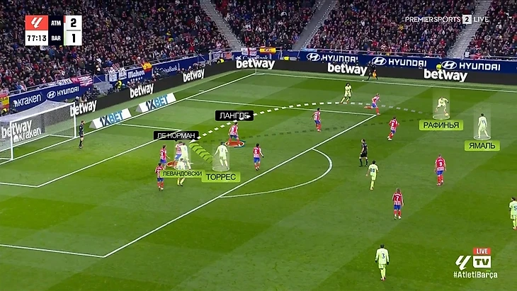 И эти ходы сработали просто блестяще. Олицетворение – второй гол «Барсы»: Рафинья с правого фланга отлично навешивает в штрафную на свободного Торреса. Ферран здесь идеально сыграл как второй нападающий, открывшись из глубины, а Левандовски сильно помог ему в этом – увел за собой Ле Нормана: