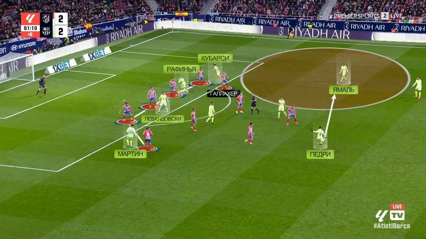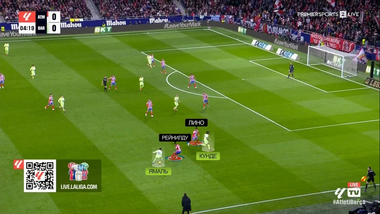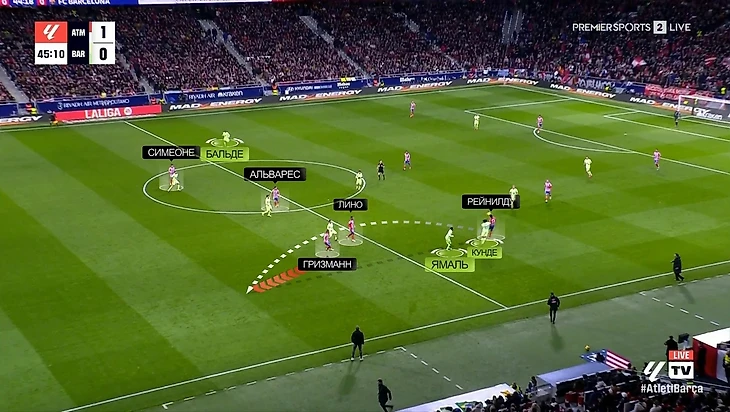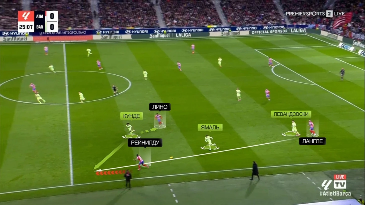 Через эту зону «Атлетико» наказывал «Барсу» в первом тайме. Рейнилду высоко поднимался при розыгрышах, Ямаль пускал его за спину, а Лино шел ближе к центру – из-за этого Кунде вынужден был разрываться между игроками: