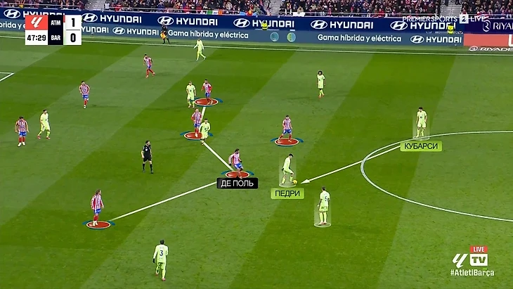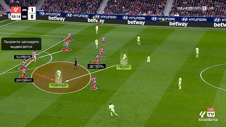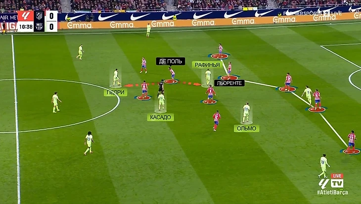 3. Плотная игра в центре поля, особенно против Педри. На него выдвигался Родриго Де Поль, а его партнеры перекрывали Педри варианты для продвижения: