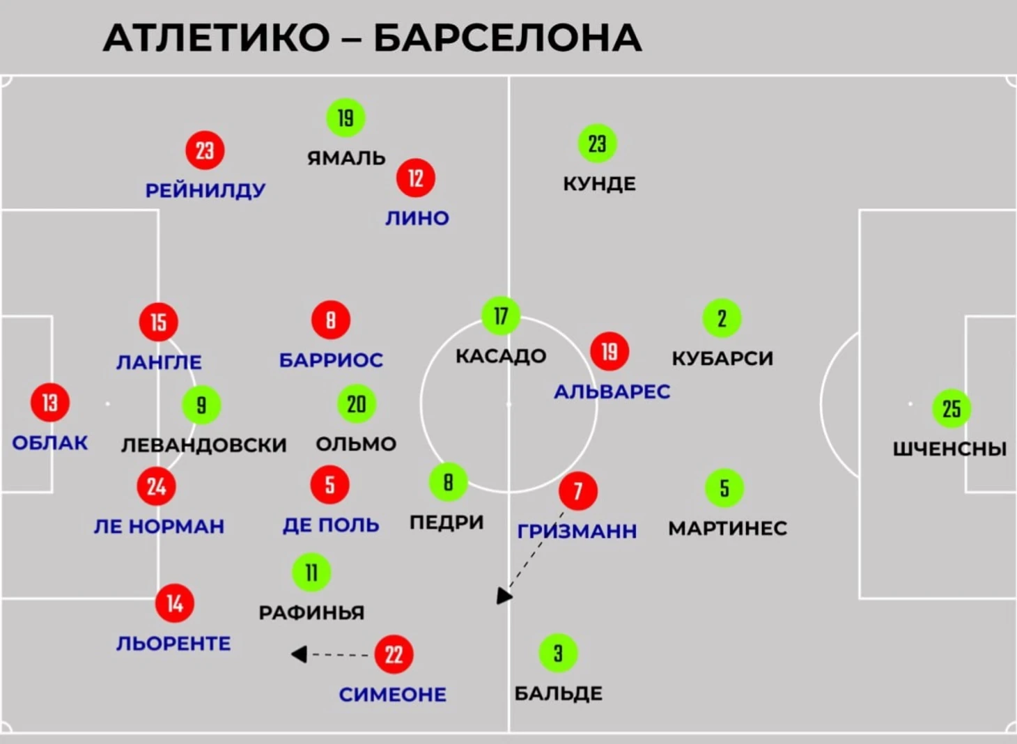 Что же касается состава от Симеоне, то в нем было три сюрприза: в паре с Лангле вышел Ле Норман, а не Хименес; слева в защите вышел Рейнилду, а не Галан (не совсем сюрприз, так как мозамбикец выходил в старте против «Реала» и был хорош в обороне), а слева в атаке появился Лино (в двух предыдущих матчах с «Барсой» выходил Галлахер).
