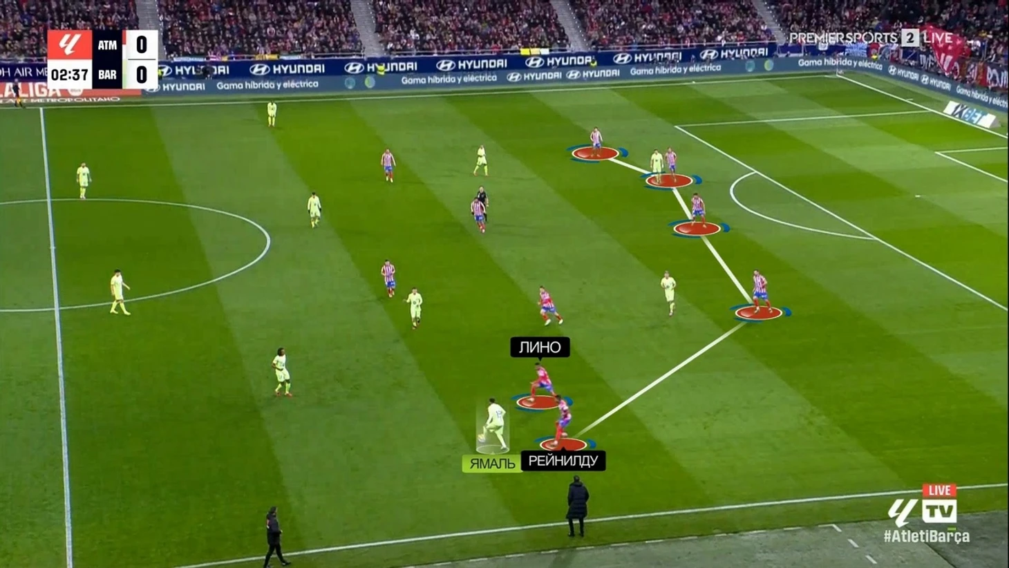 2. Фланг Рейнилду – Лино. В кубковом матче Ямаль просто разрывал Хави Галана, поэтому в этот раз Симеоне выставил более оборонительного исполнителя на эту позицию. Рейнилду дисциплинированно играл по Ямалю – выдвигался за ним, как только Ламин получал мяч: