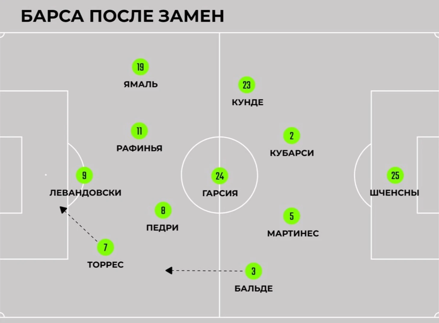 В этом сезоне мы привыкли к конфигурации, когда вингеры (Рафинья и Ямаль) давят на ЦЗ соперника, а Левандовски располагается глубже и играет по опорникам. Но в последних матчах Флик чуть изменил эту модель: теперь Левандовски поднимается на линию с Рафиньей, а Ямаль (а за ним и Кунде) уходят глубже на фланг: