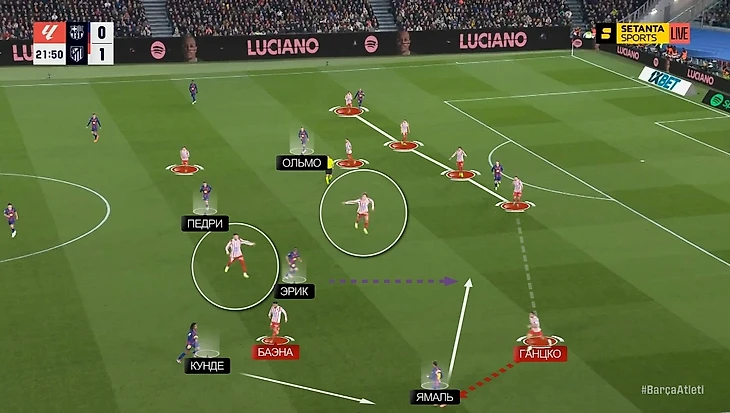 Помимо таких спусков полузащиту, Рафа довольно часто менялся полуфлангами с Дани Ольмо, что тоже вносило элемент запутанности в оборону «Атлетико». Почему это так важно? Потому что именно на левом фланге обороны «матрасников» (соответственно, правый фланг атаки «Барсы») крылась одна из главных уязвимостей – пространство между центральным защитником (Лангле) и крайним защитником (Ганцко). Словак играл плотно по Ламину Ямалю, а тот, как обычно, держал широкую позицию – что как раз и открывало это самое пространство в полуфланге.