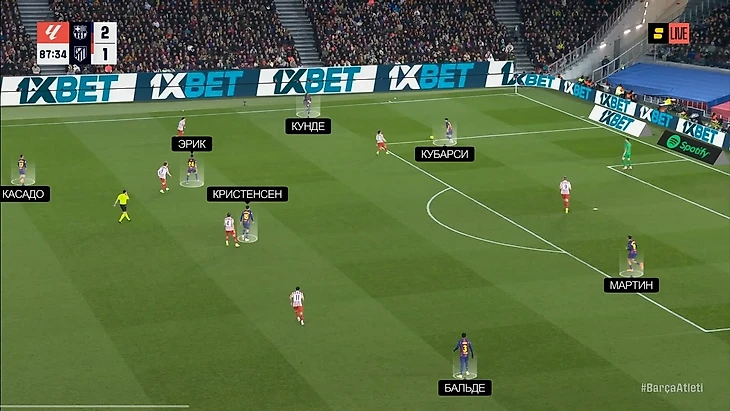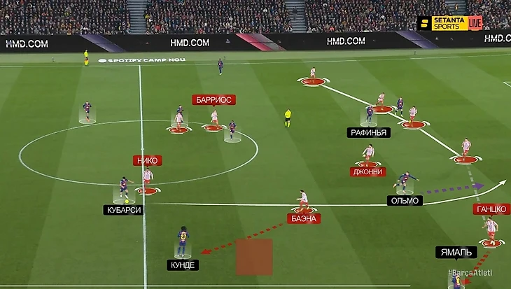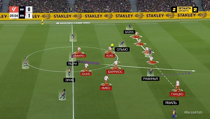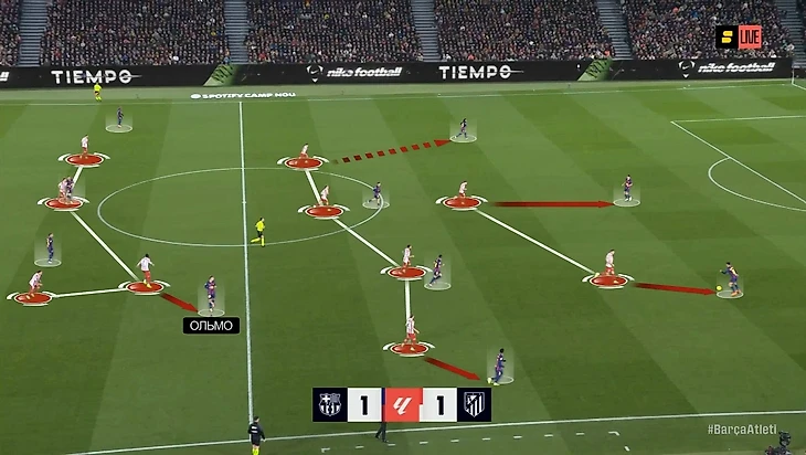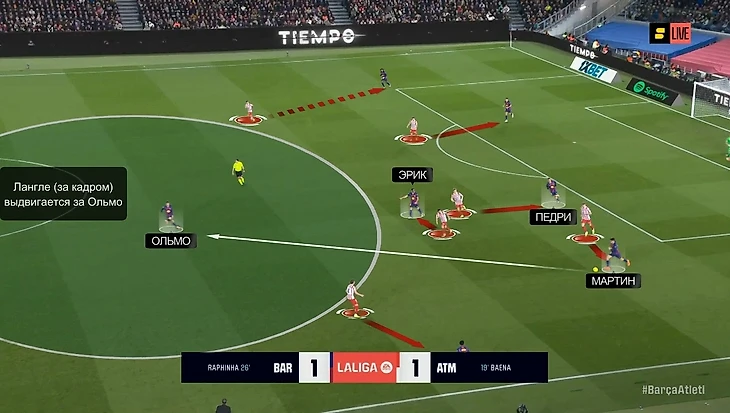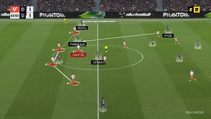 В моменте с победным голом «Барсы» это аукнулось «Атлетико», потому что каталонцы вышли из-под этого давления максимально легко: возник разрыв между прессингующей группой и четверкой защитников, в который спустился Дани Ольмо. Отдельного внимания заслуживает тот факт, что здесь Ольмо и Рафинья снова поменялись полуфлангами, однако выдвигался на Дани все равно Лангле, которому это делать вообще не сподручно, потому что он левый ЦЗ (было бы логичнее Хименесу или Молине выдвинуться):