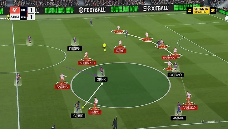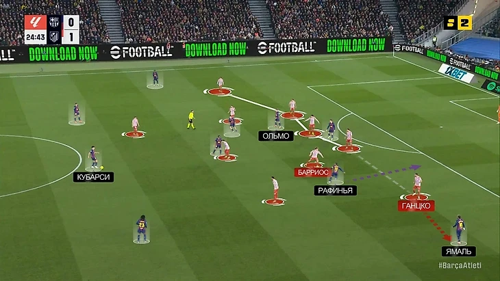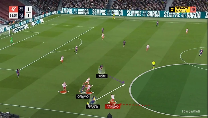 — Эрик Гарсия с позиции опорника тоже пользовался хаосом в обороне «Атлетико», который провоцировала «Барса» своим движением. Пример: здесь Ольмо оказался в левом полуфланге (при этом Рафинья не поменялся с ним местами – тоже остался слева), Баэна выдвигается на Кунде, а Ганцко плотно играет с Ямалем – Эрик из глубины врывается в свободную зону, и Барриосу пришлось на нем фолить: