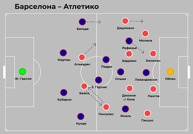 Диего Симеоне выставил состав с более оборонительным наполнением, чем обычно: чистый опорник Джонни Кардозо в паре с Барриосом в центре поля и Давид Ганцко в роли левого защитника. По намерениям «Атлетико» предстал в роли типичной команды, проезжающей на «Камп Ноу»: прессинг, но скорее с намерением замедлить розыгрыш «Барсы» и схема с пятеркой в задней линии. Это точно не лишено смысла, но далеко от классического сценария этого сезона, в котором «Барселона» испытывала наибольшие трудности.