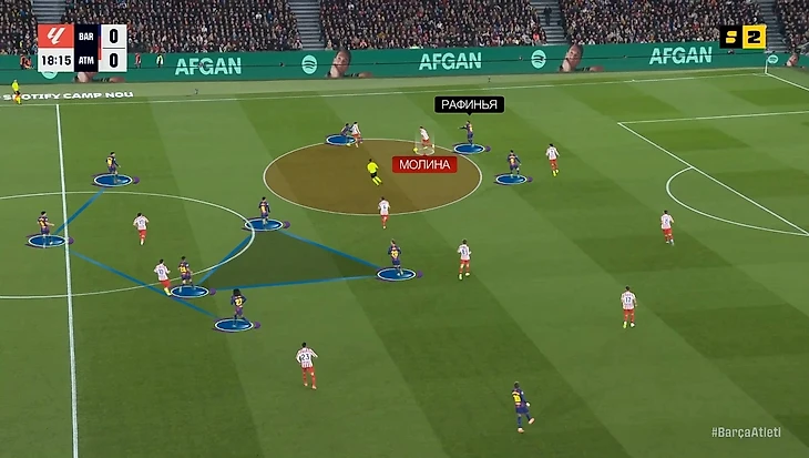 — Рафинья спускался в полузащиту, предлагая себя как дополнительный вариант, и путая ориентировки «Атлетико» в середине. Пример: здесь Рафа как раз спустился и предложил дополнительный вариант для Пау Кубарси, а Педри пошел правее – Кубарси решает играть на него: