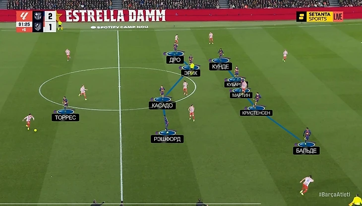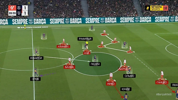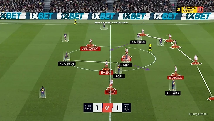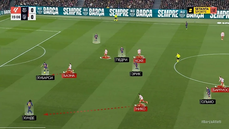— Педри спускался глубже, вытягивая за собой одного из полузащитников «Атлетико» – пространства в середине становилось больше, плотность обороны «матрасников» уменьшалась. Вот один из примеров еще в начале матча: здесь Педри как раз спустился к защитникам, вытянул за собой Барриоса, и Джонни остался между Рафиньей и Ольмо в полуфлангах. Баэна выдвинулся на Кунде – у Кубарси появился вариант с передачей на Ольмо, что привело к достаточно опасной атаке: