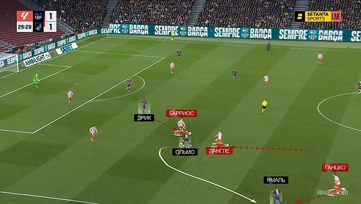 Эпизод с пенальти на Дани Ольмо начинался похожим образом: Баэна ориентирован на Кубарси, Нико играет по Кунде, Барриос играет по Ольмо, а Ганцко плотно действует по Ямалю – возникает пространство для рывка Эрика: